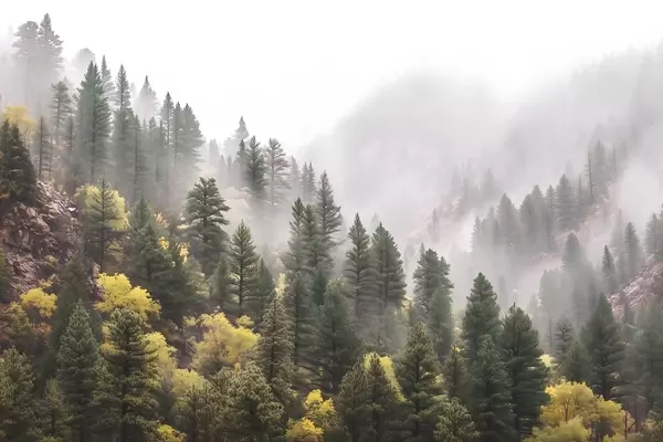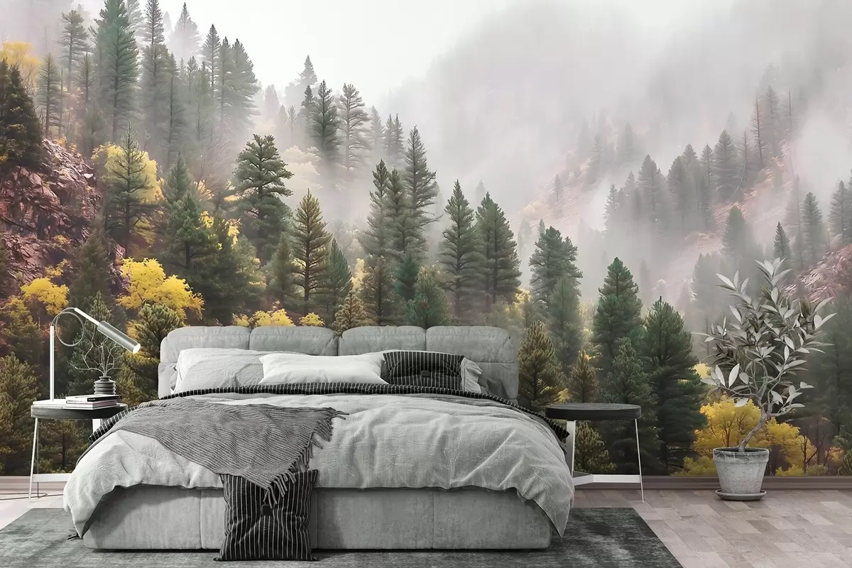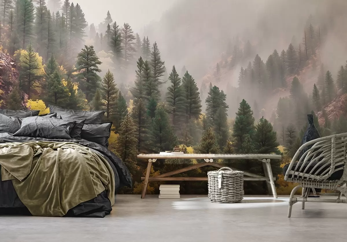 Fototapety Atmosférický hmlistý borovicový les v horách Nr. w09463