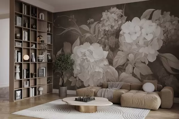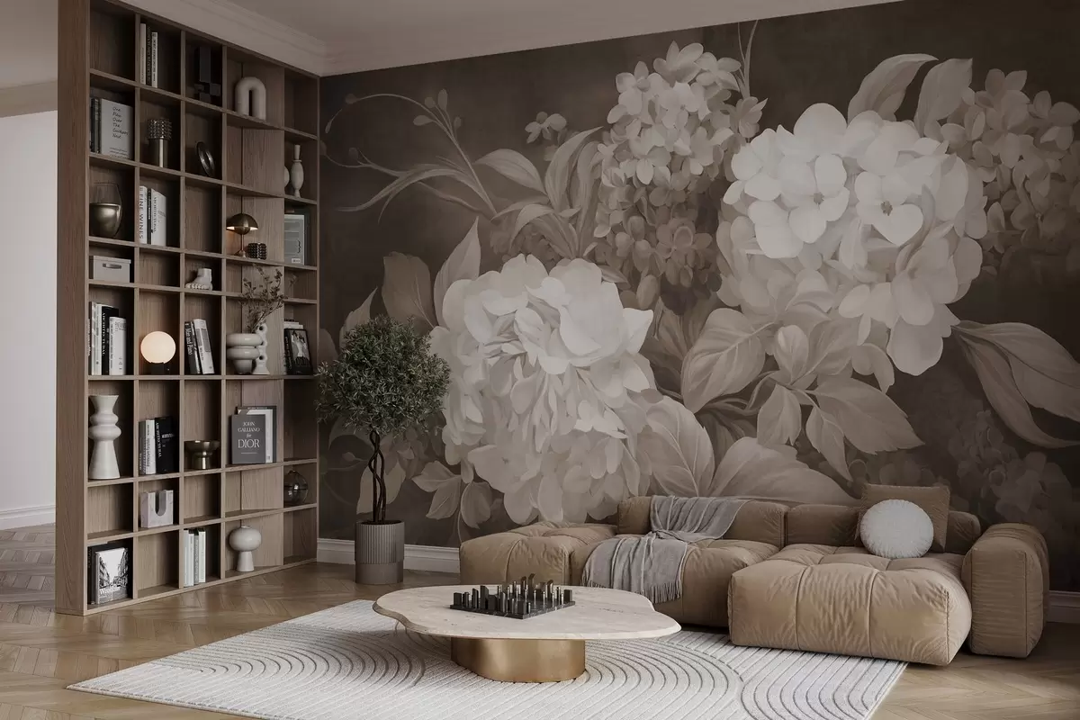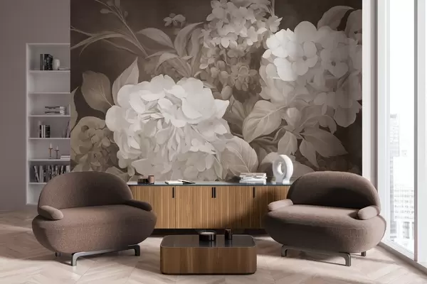 Fototapety Textúrovaná imitácia maľby v sépii s kvetmi hortenzií s veľkými listami, abstraktným a tmavým pozadím Nr. w09465