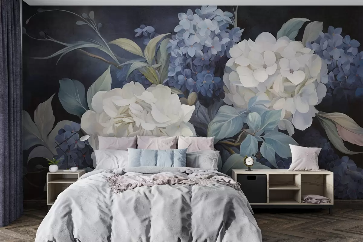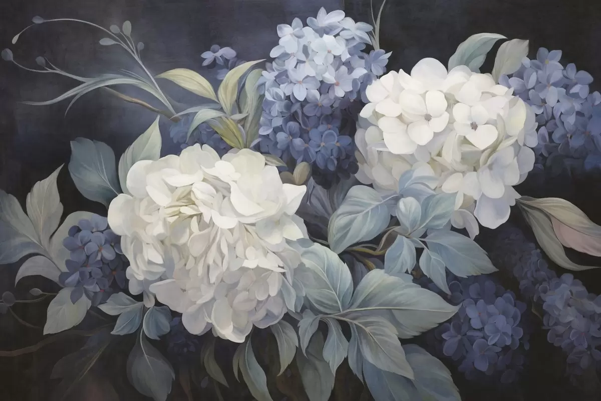 Fototapety Textúrovaná tmavomodrá maľba imitácia kvetov hortenzií s veľkými listami, abstraktné a tmavé pozadie Nr. w09465v1