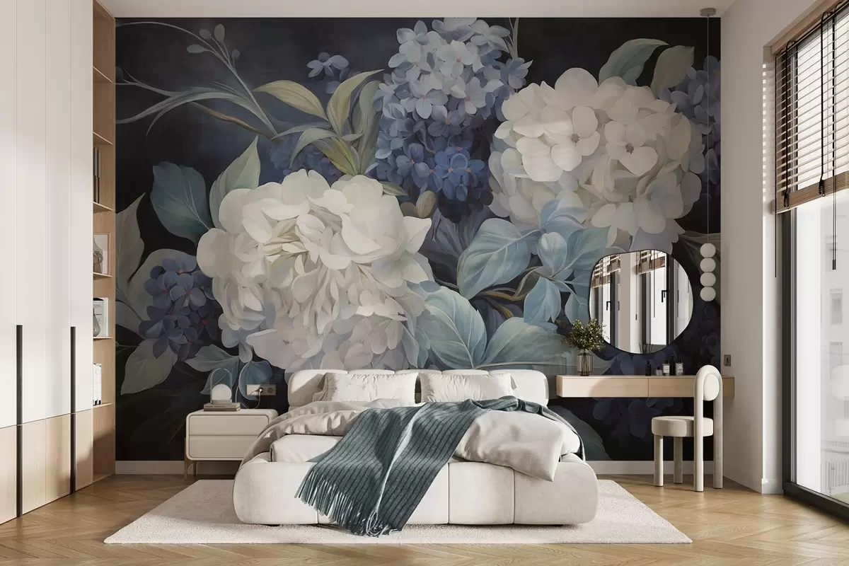 Fototapety Textúrovaná tmavomodrá maľba imitácia kvetov hortenzií s veľkými listami, abstraktné a tmavé pozadie Nr. w09465v1