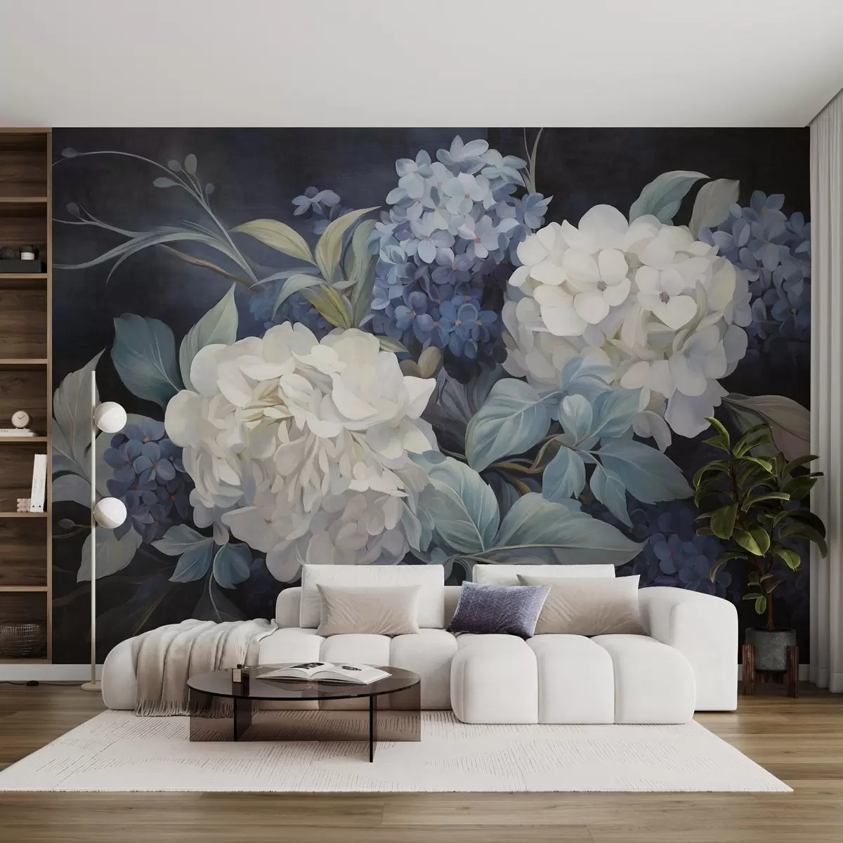 Fototapety Textúrovaná tmavomodrá maľba imitácia kvetov hortenzií s veľkými listami, abstraktné a tmavé pozadie Nr. w09465v1