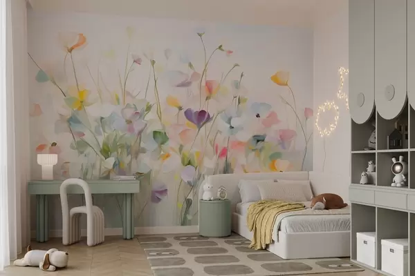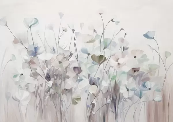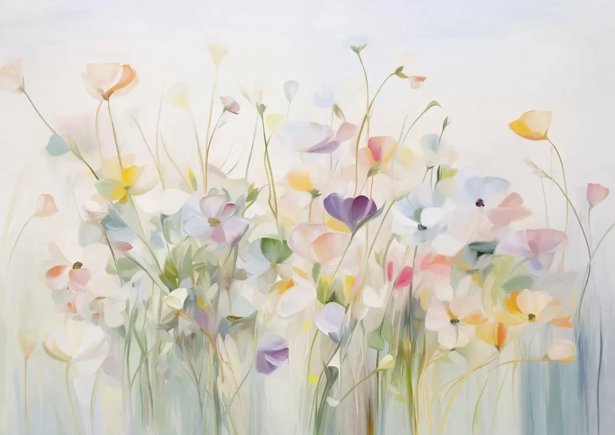 Fototapety Abstraktné pole farebných kvetov s dlhými stonkami a zelenými listami, textúrované, pastelové, svetlé farby Nr. w09466