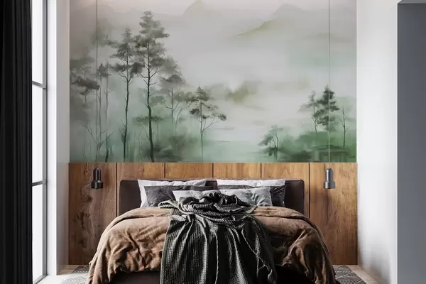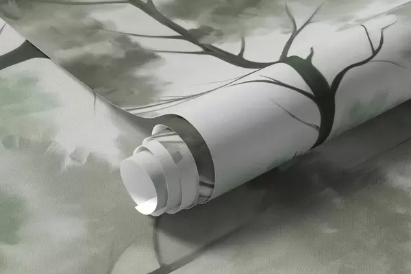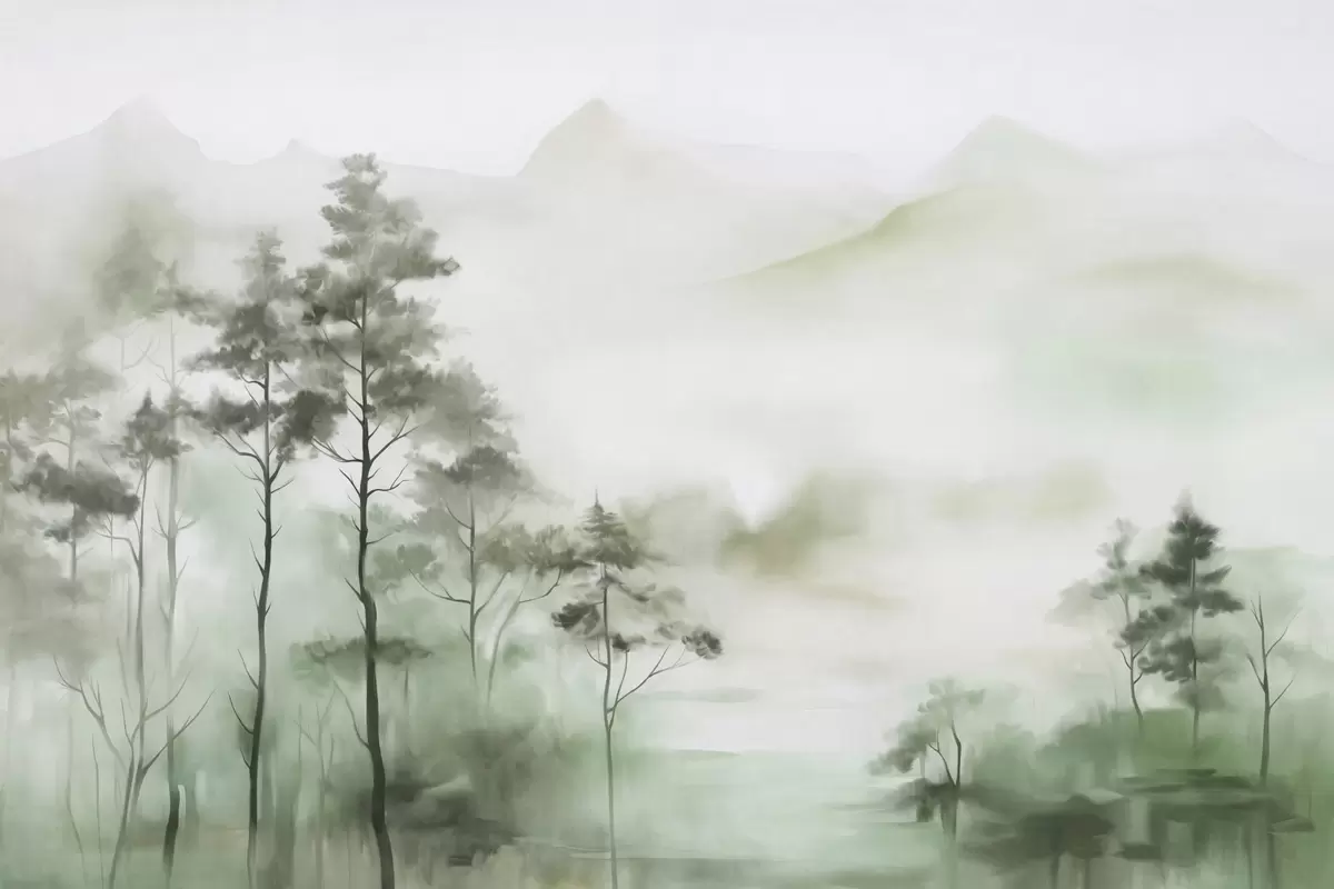 Fototapety Hmlistá krajina s vysokými stromami a horami v tlmených zelených a sivých odtieňoch, minimalistický štýl, textúrovaná Nr. w09469