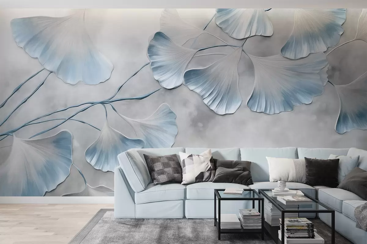 Fototapety Listy ginkga biloba s modrými okrajmi na vetve, sivé textúrované pozadie, elegantný a minimalistický dizajn Nr. w09472v1
