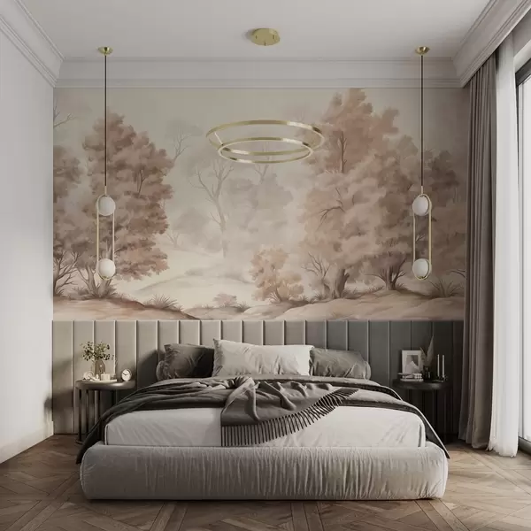Fototapety Textúrovaná krajinomaľba imitujúca les s vysokými stromami a trávou, tlmené a jemné farby, upokojujúca scéna Nr. w09474