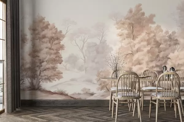 Fototapety Textúrovaná krajinomaľba imitujúca les s vysokými stromami a trávou, tlmené a jemné farby, upokojujúca scéna Nr. w09474