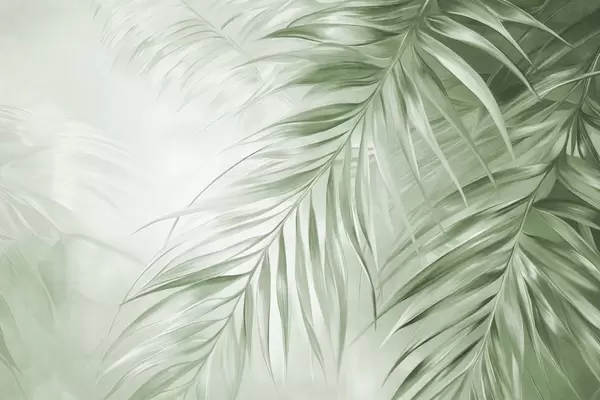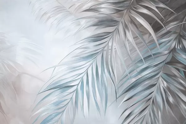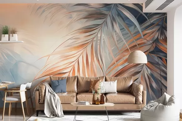 Fototapety Palmové listy v oranžových a modrých odtieňoch, svetlé textúrované pozadie s jemnými farbami, elegantný tropický štýl Nr. w09475