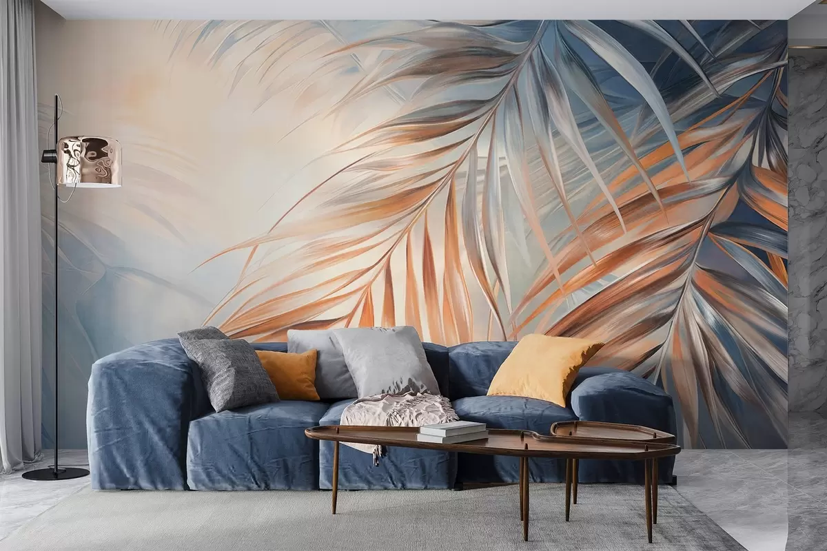 Fototapety Palmové listy v oranžových a modrých odtieňoch, svetlé textúrované pozadie s jemnými farbami, elegantný tropický štýl Nr. w09475