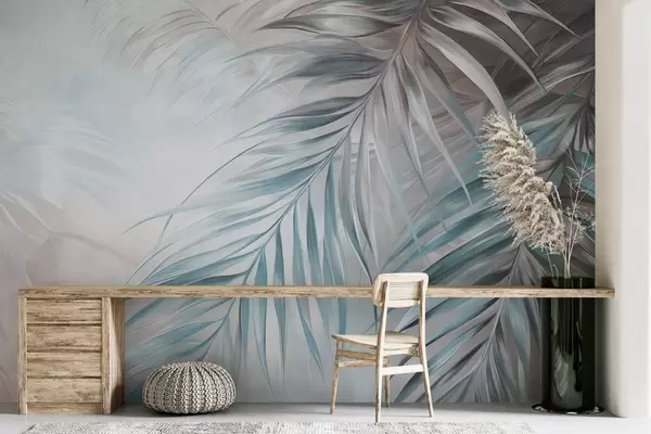 Fototapety Palmové listy v sivých a modrých odtieňoch, svetlé textúrované pozadie s jemnými farbami, elegantný tropický štýl Nr. w09475v1
