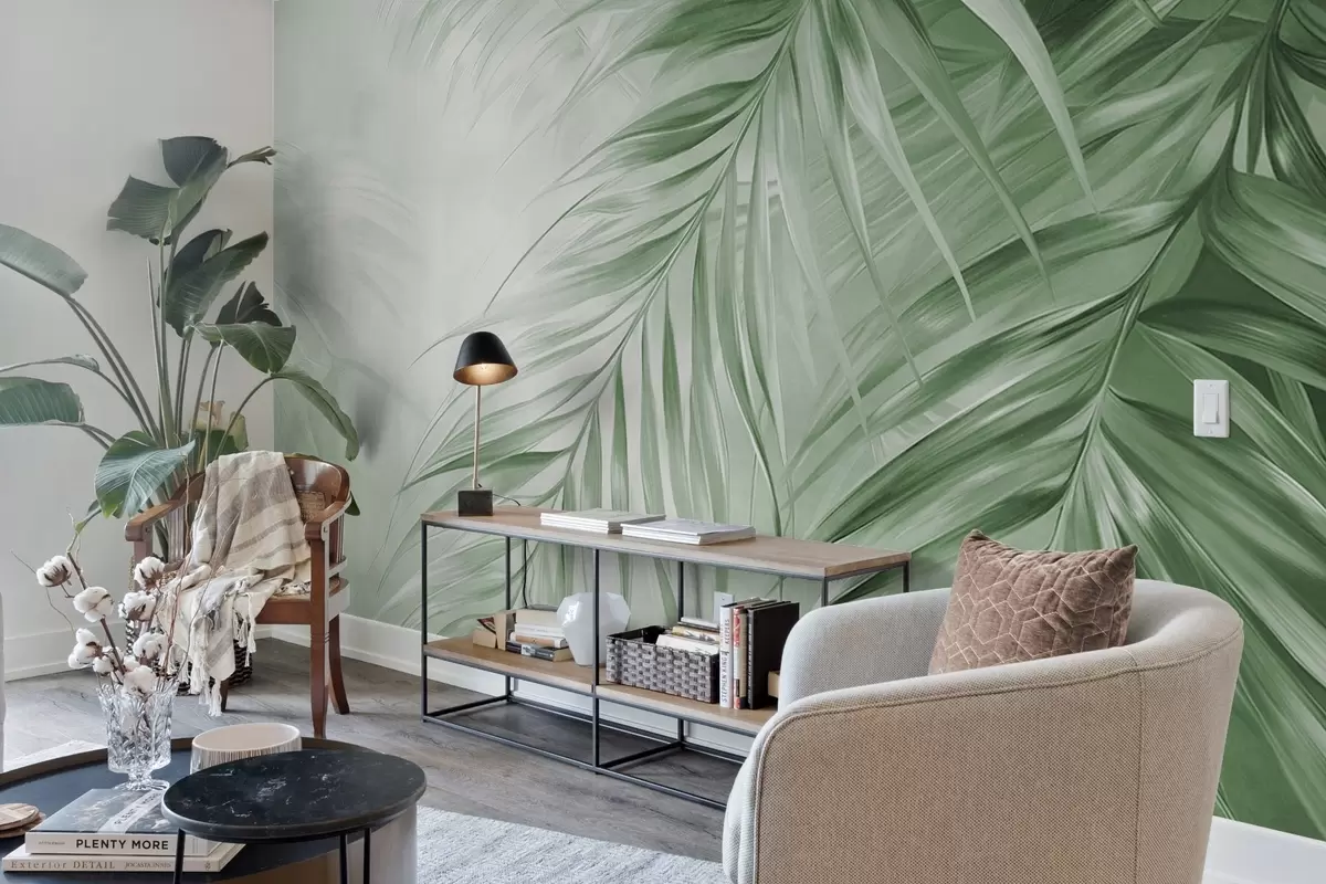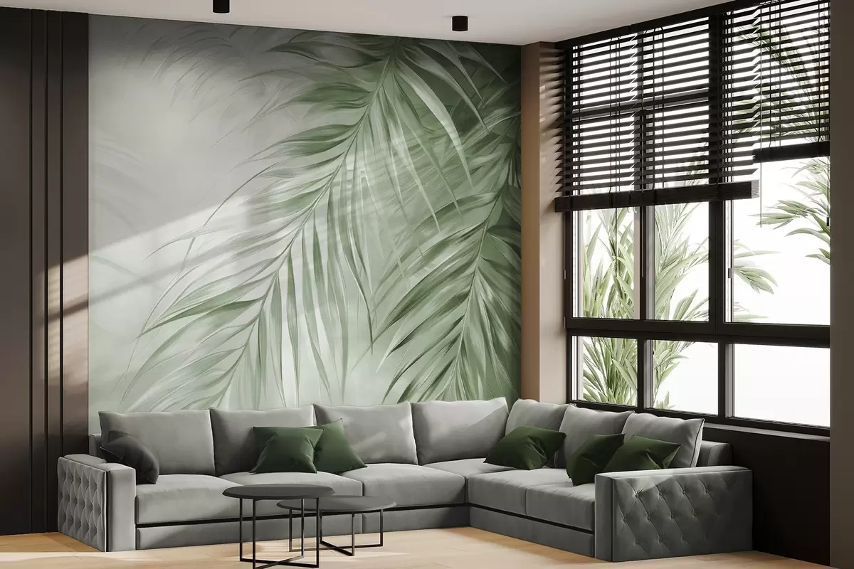 Fototapety Palmové listy so zelenými odtieňmi, svetlé textúrované pozadie s jemnými farbami, elegantný tropický štýl Nr. w09475v2