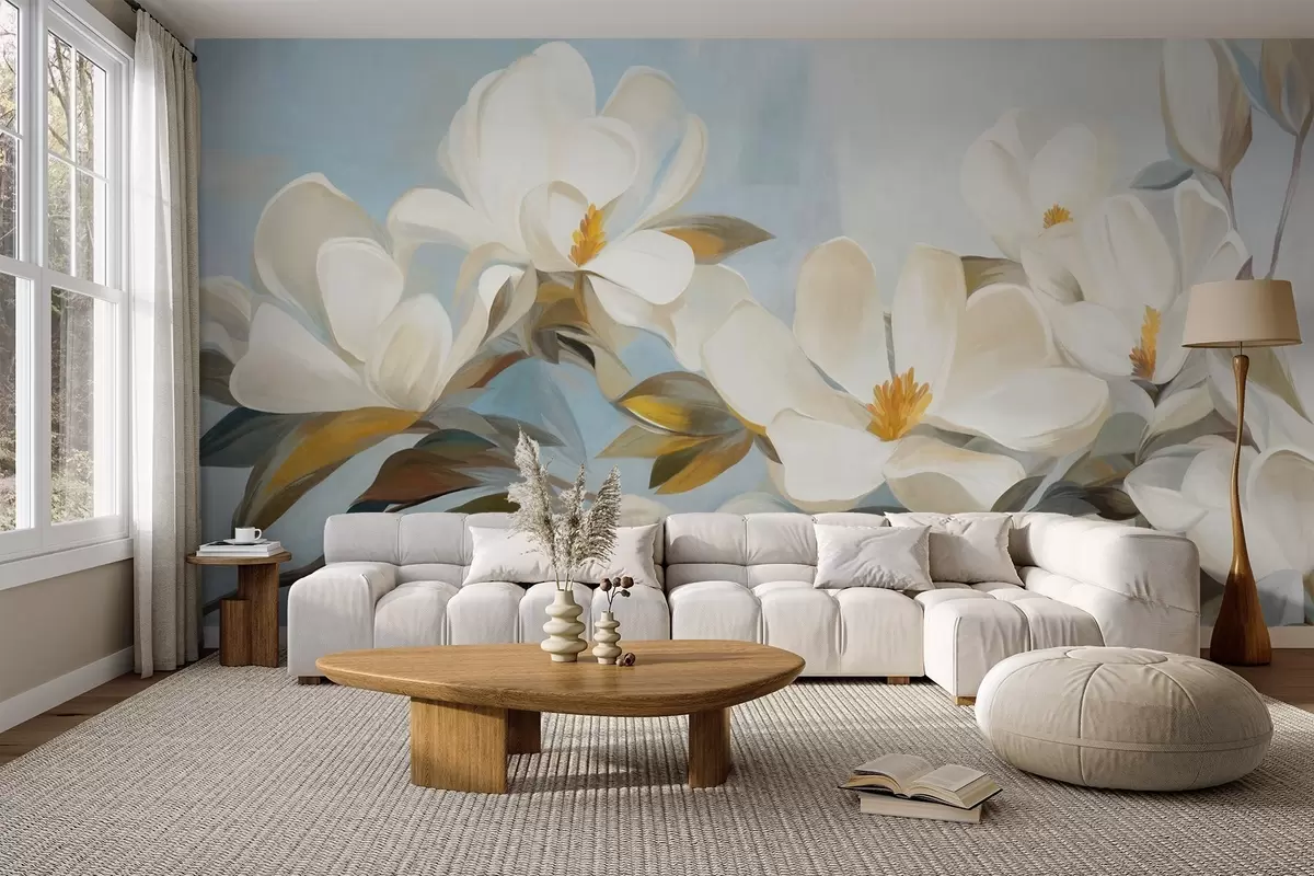 Fototapety Biele magnólie so zelenými listami na svetlo modrom pozadí s imitáciou abstraktných ťahov štetcom Nr. w09478