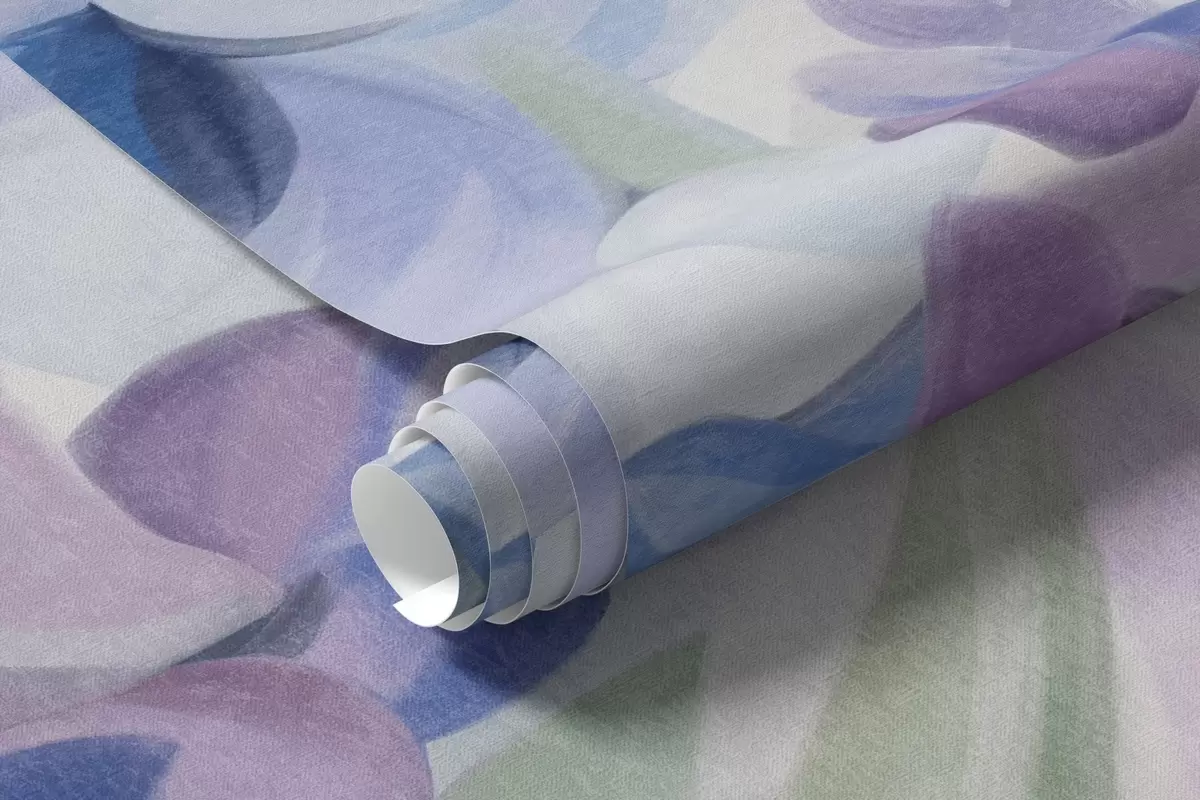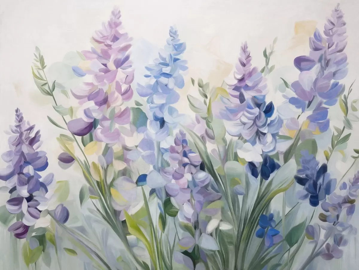 Fototapety Fialové a modré textúrované kvety s modrými listami, svetlé pozadie, jemné ťahy štetcom, žiarivé farby Nr. w09482