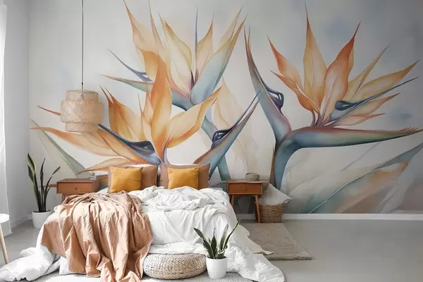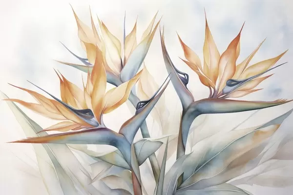 Fototapety Kvetina rajského vtáka, strelitzia s oranžovými okvetnými lístkami, jemný akvarelový štýl, svetlé pozadie Nr. w09483