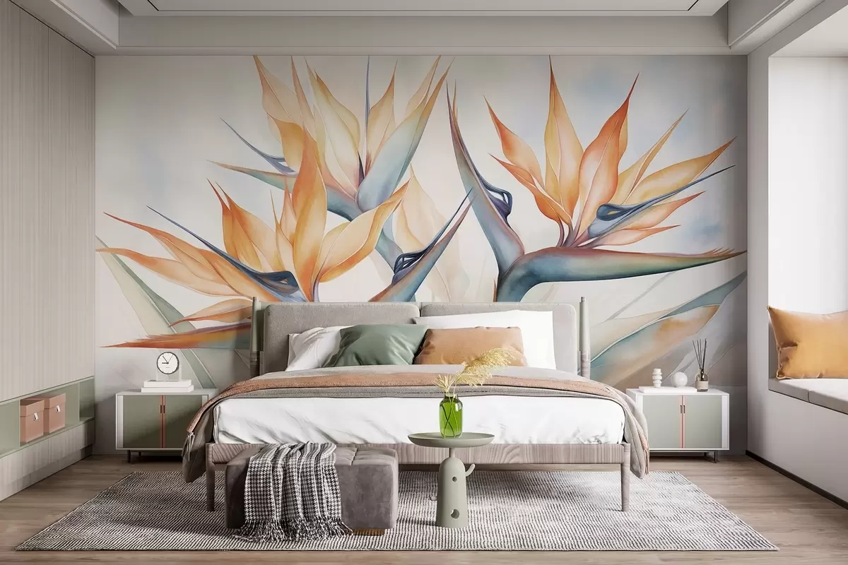 Fototapety Kvetina rajského vtáka, strelitzia s oranžovými okvetnými lístkami, jemný akvarelový štýl, svetlé pozadie Nr. w09483