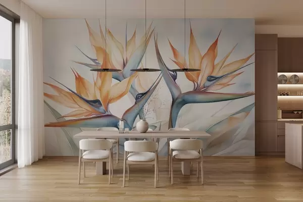 Fototapety Kvetina rajského vtáka, strelitzia s oranžovými okvetnými lístkami, jemný akvarelový štýl, svetlé pozadie Nr. w09483