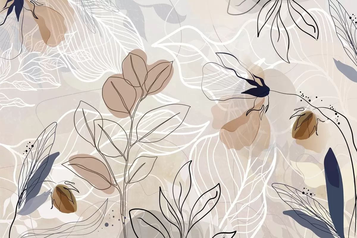 Fototapety Béžové abstraktné pozadie s listami a kvetmi, moderné, minimalistické, organické tvary, botanický potlač Nr. w09487