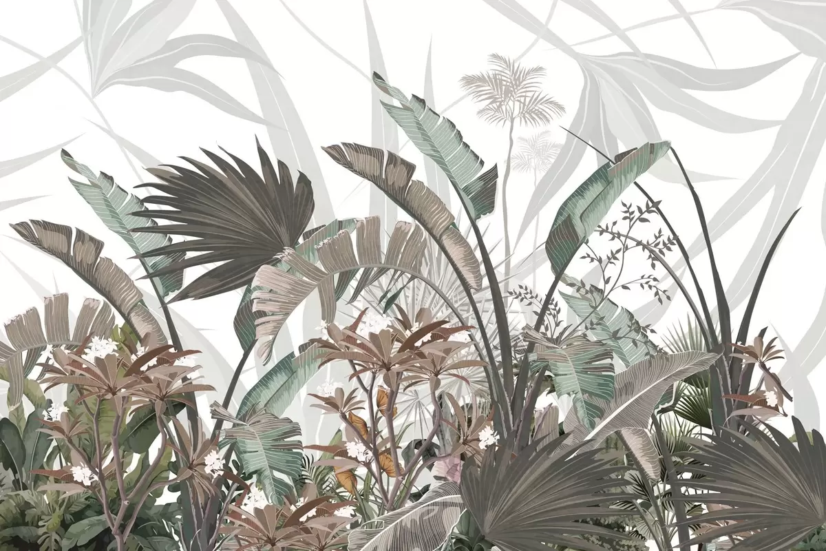 Fototapety Tropické textúrované listy s kvetmi, palmy, kvety plumérie, pastelové farby, biele pozadie, džungľa Nr. w09488