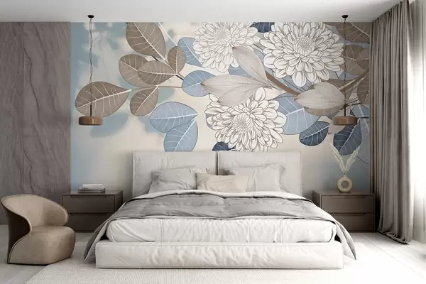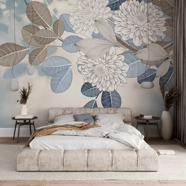 Fototapety Biele kvety s modrými a hnedými listami, svetlomodré textúrované pozadie, kvetinová výzdoba, detailná kresba Nr. w09496