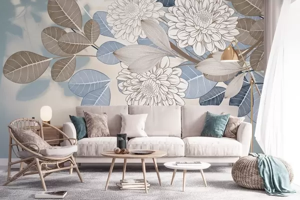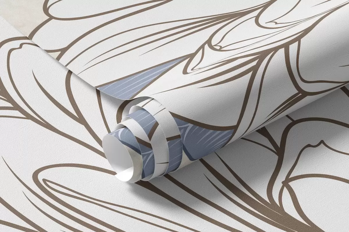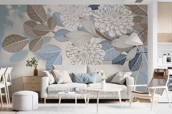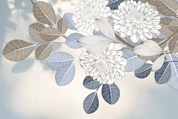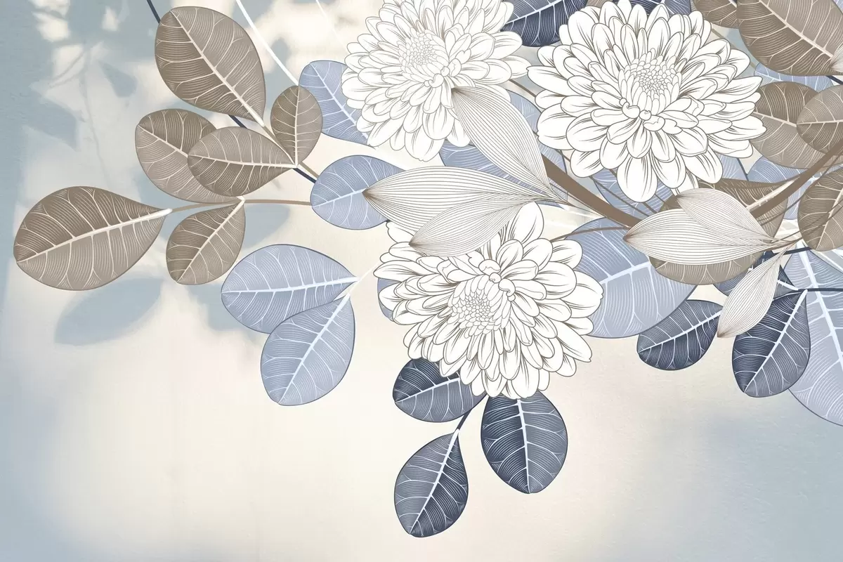 Fototapety Biele kvety s modrými a hnedými listami, svetlomodré textúrované pozadie, kvetinová výzdoba, detailná kresba Nr. w09496