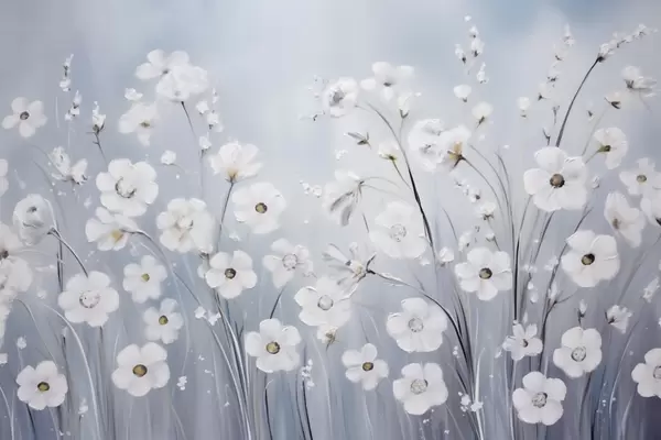 Fototapety Biele kvety na pozadí modrých hôr a jazera v štýle olejomaľby Nr. w09516