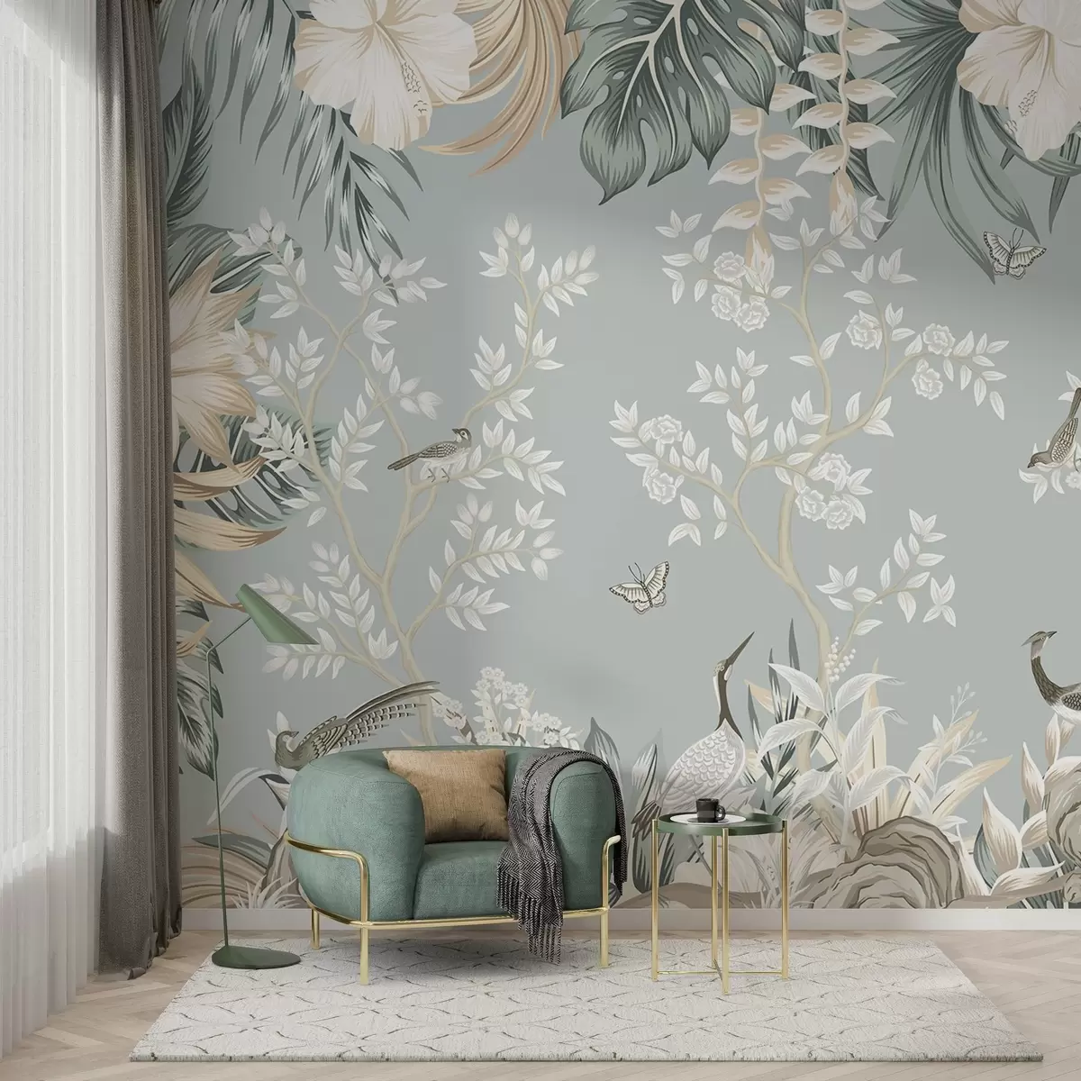 Fototapety Tropické textúrované pastelové umenie s vtákmi, motýľmi, kvetmi ibišteka, palmovými listami a stromami na svetlomodrom pozadí Nr. w09528