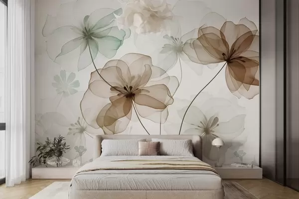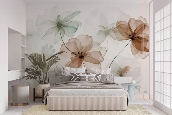 Fototapety Priehľadné kvety s hnedými a zelenými okvetnými lístkami, dlhé stonky, svetlé pozadie, jemné farby, textúrovaný kvetinový vzor Nr. w09529