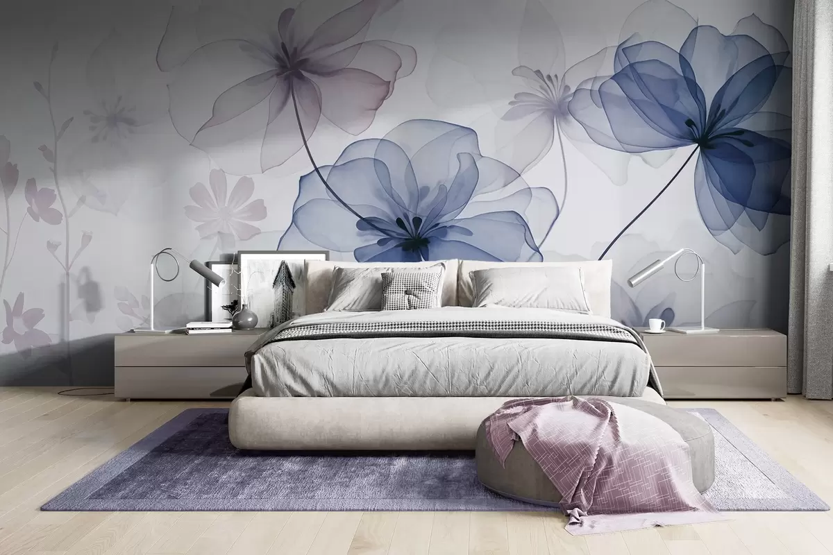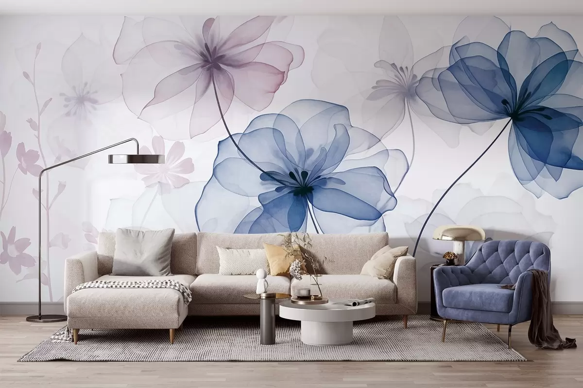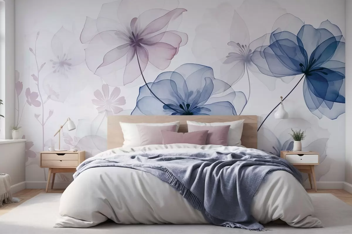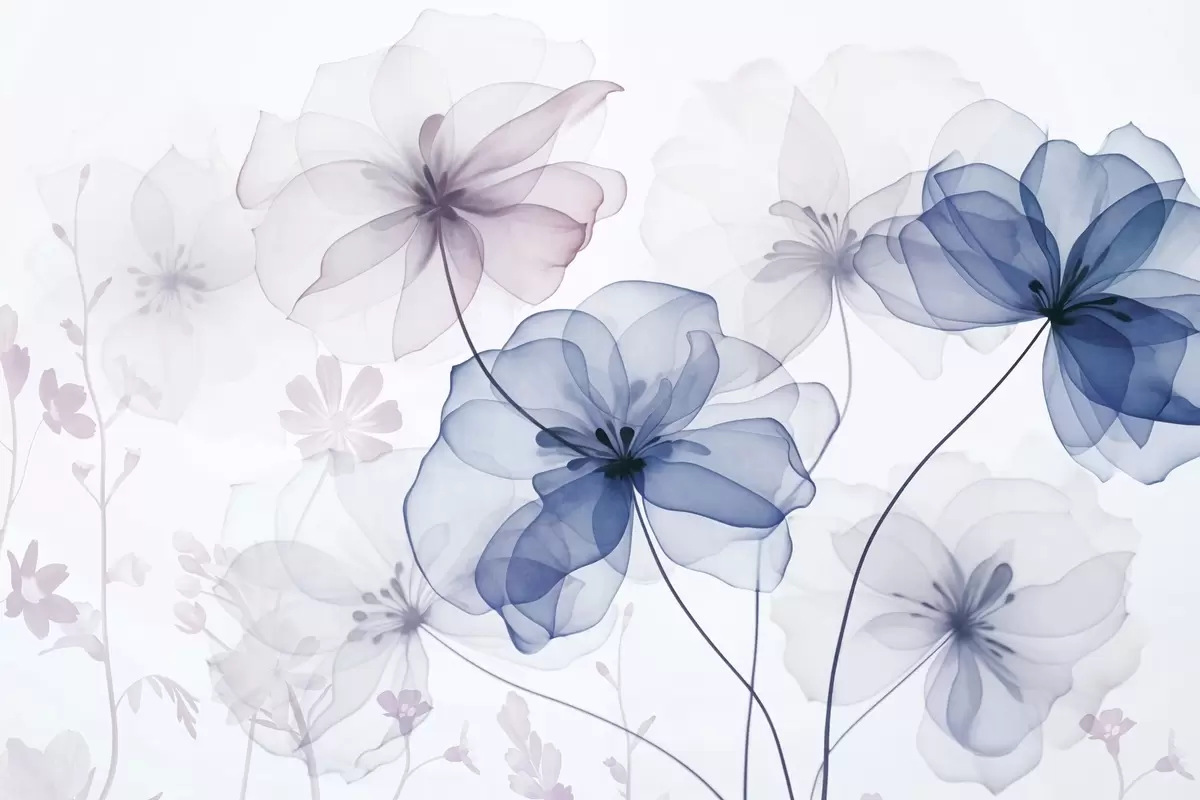 Fototapety Priehľadné kvety s tlmenými modrými a ružovými okvetnými lístkami, dlhé stonky, svetlé pozadie, jemné farby, textúrovaný kvetinový vzor Nr. w09529v1