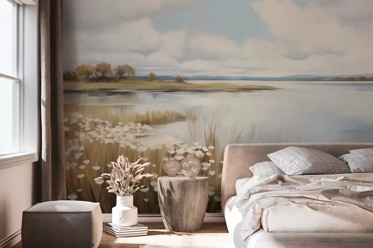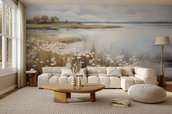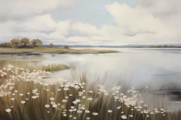 Fototapety Textúrovaná krajina, pole bielych kvetov a vysokej trávy, jazero v pozadí, trávnatý kopec so stromami, jemné farby Nr. w09530