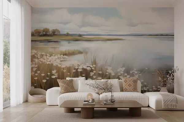 Fototapety Textúrovaná krajina, pole bielych kvetov a vysokej trávy, jazero v pozadí, trávnatý kopec so stromami, jemné farby Nr. w09530