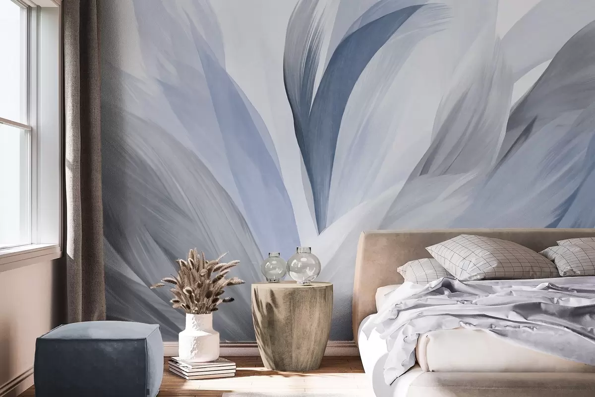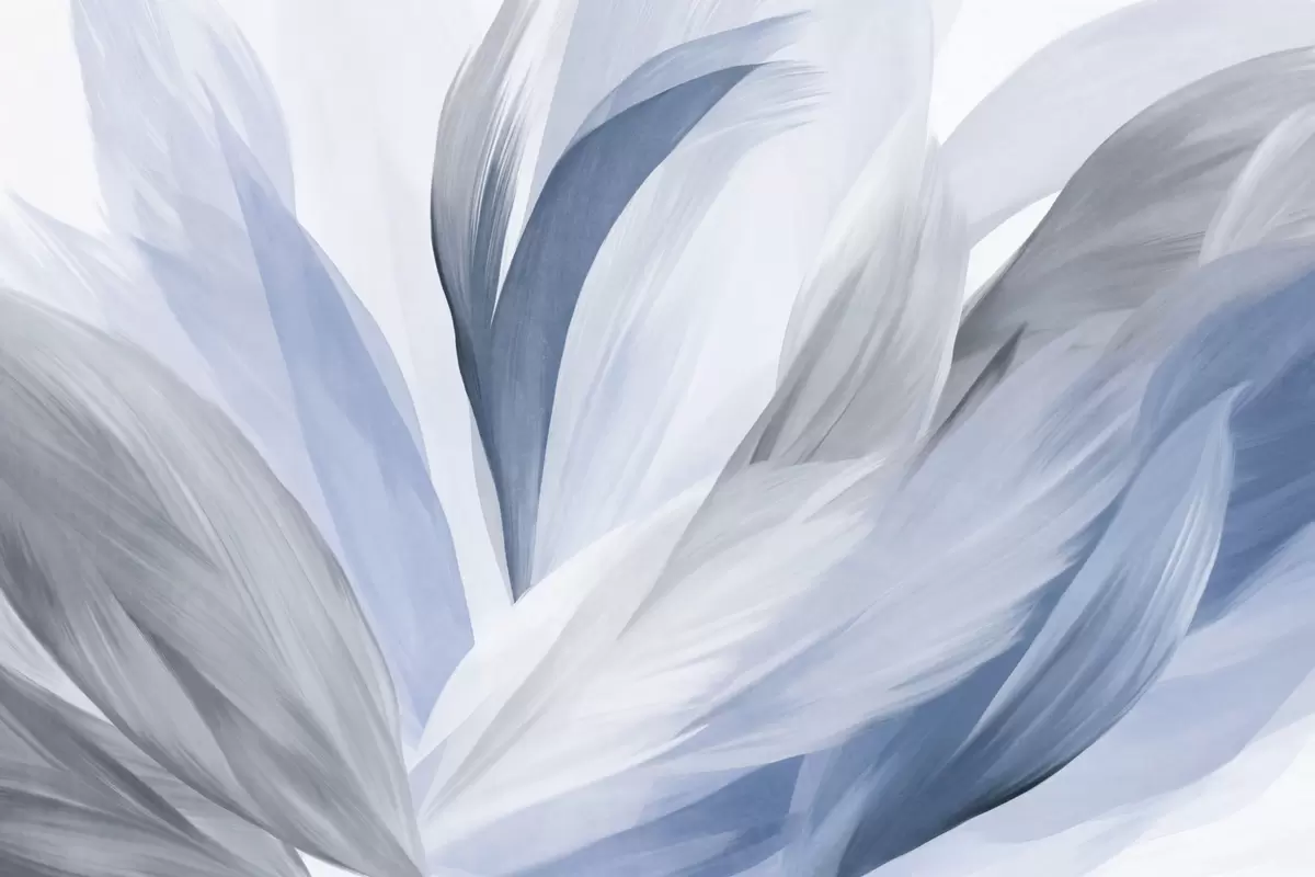 Fototapety Abstraktné textúrované pierka v modrej, bielej a sivej farbe a rôznych odtieňoch, prekrývajúce sa na bielom pozadí Nr. w09531v1