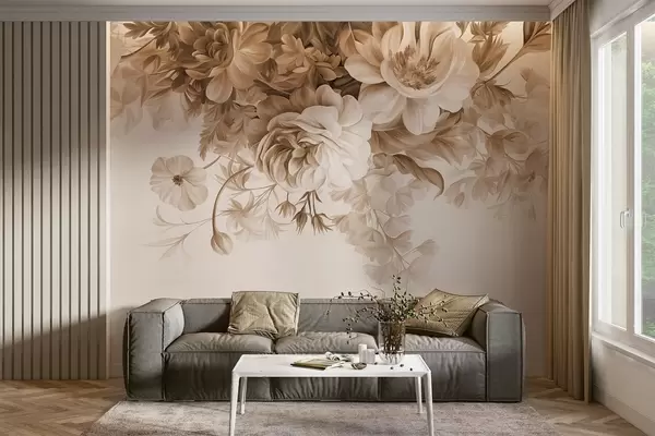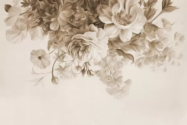 Fototapety Vintage kvetinová kompozícia s ružami, pivóniami a ďalšími textúrovanými kvetmi s lístím na svetlom pozadí Nr. w09532v1