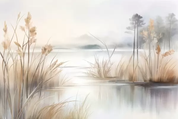 Fototapety Krajina s jazerom a vysokou trávou v popredí, hory v pozadí, jemné farby, textúrované Nr. w09534