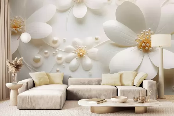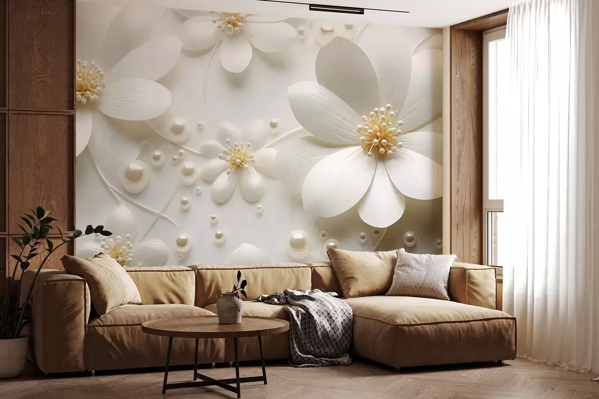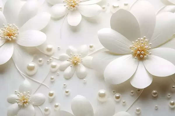 Fototapety Biele kvety s perličkami rozptýlenými na bielom pozadí, elegantný a minimalistický dizajn, textúrovaný Nr. w09535