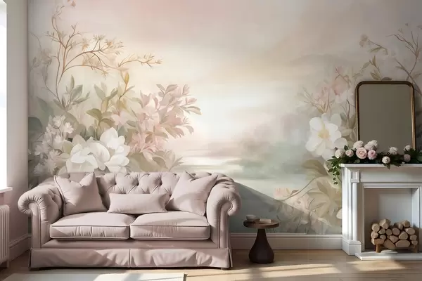 Fototapety Krajina s riekou obklopenou kvetmi a rastlinami, jemné farby, ružová obloha, štýl s akvarelovou textúrou Nr. w09537