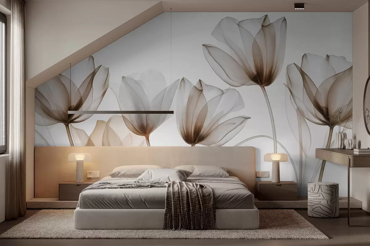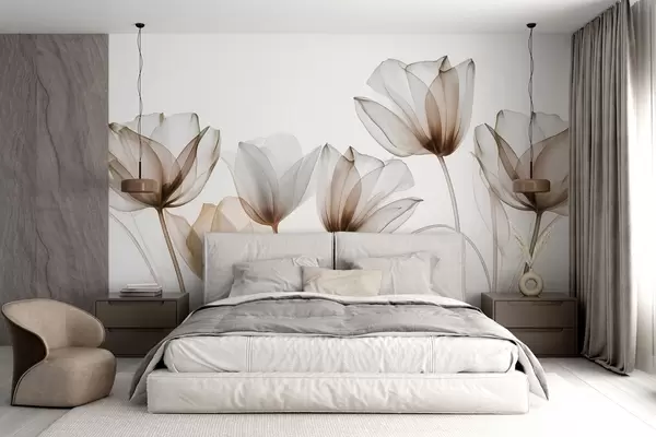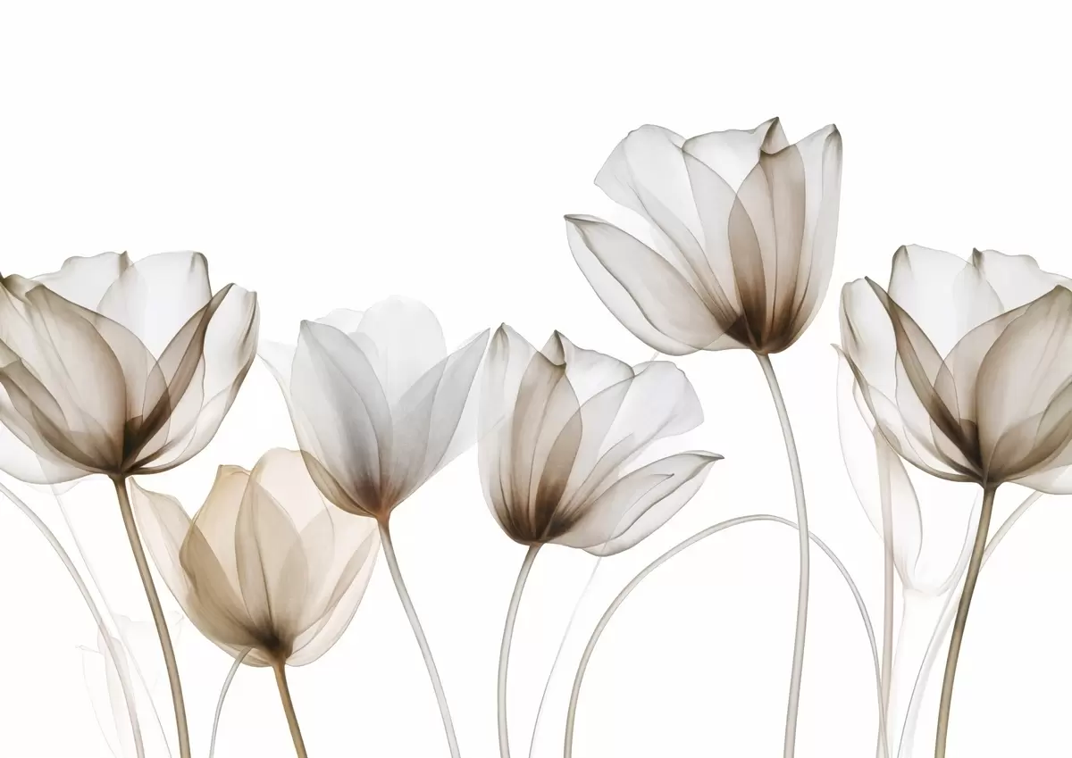 Fototapety Priehľadné hnedé a biele tulipány s dlhými stonkami na svetlom pozadí, jemné a textúrované kvetinové umenie Nr. w09538v1