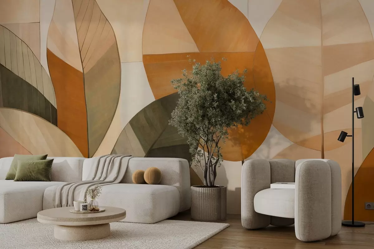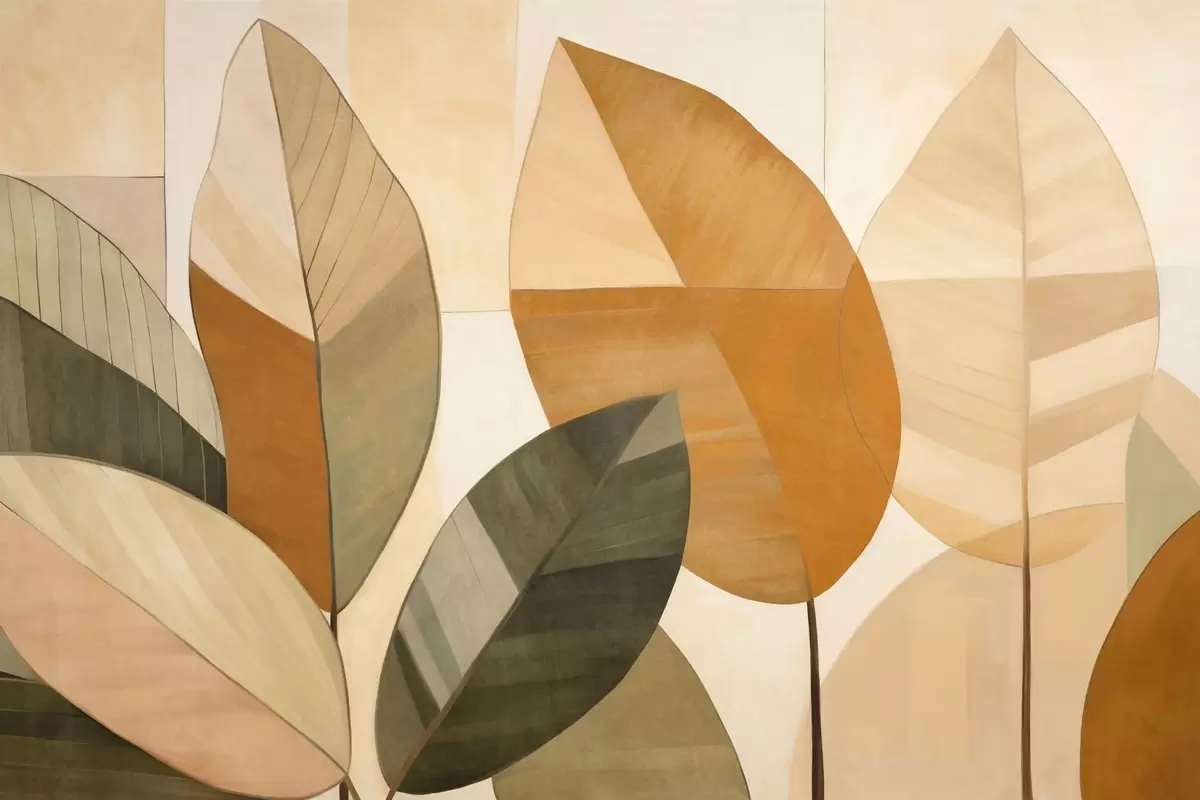 Fototapety Abstraktné veľké listy v odtieňoch oranžovej, hnedej a zelenej farby, textúrované, usporiadané na svetlom pozadí Nr. w09539