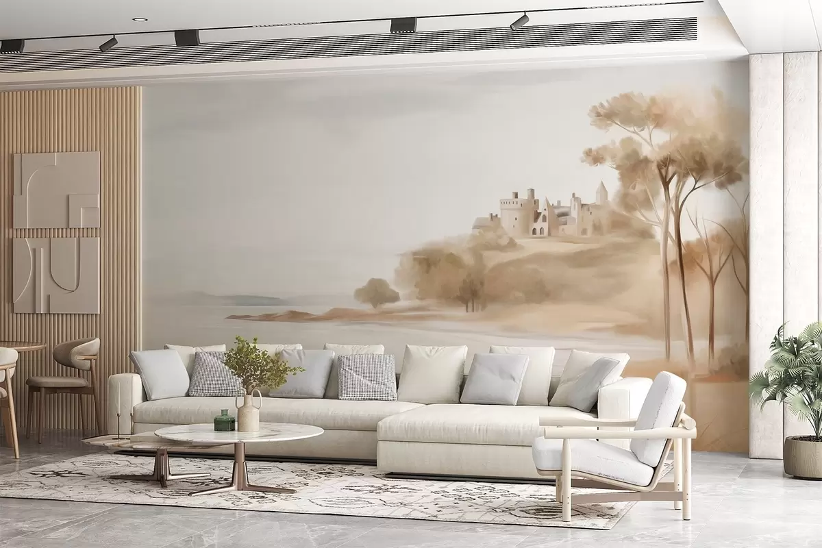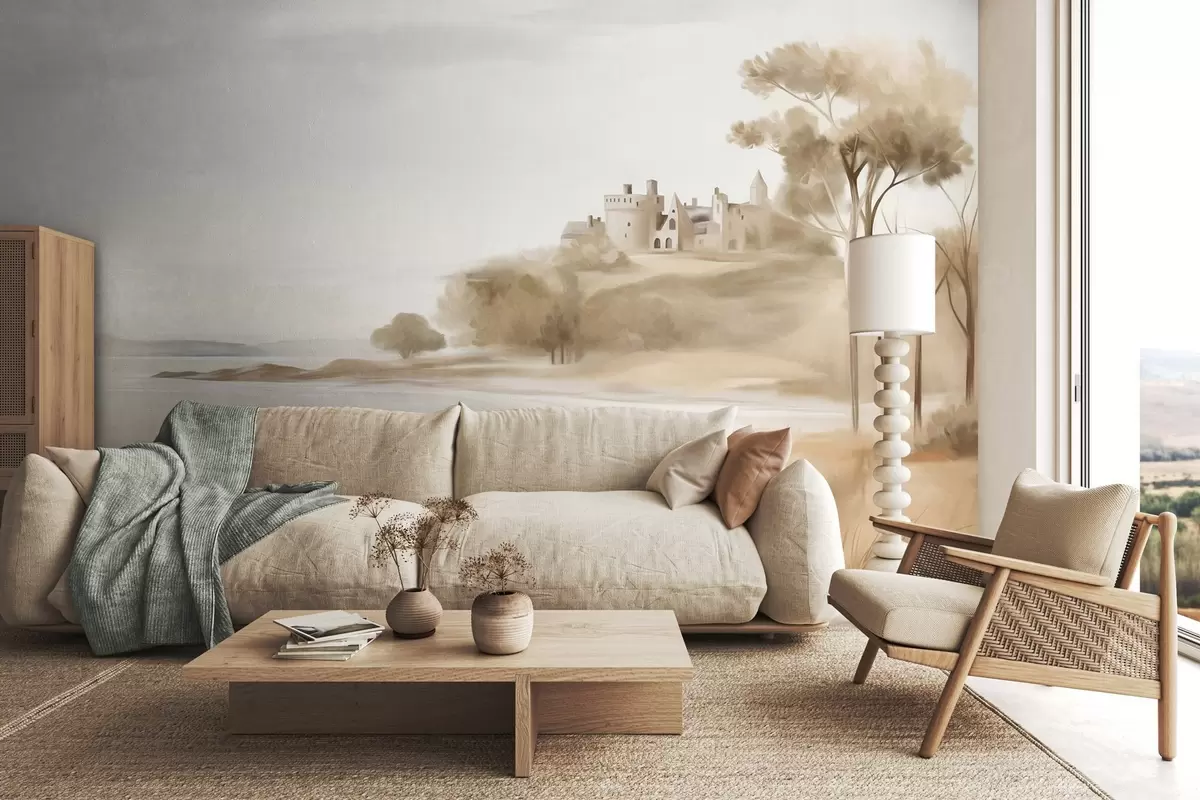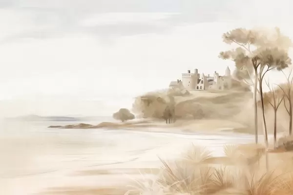 Fototapety Krajina s hradom na kopci pri mori, piesková pláž v popredí, tlmené farby, textúrované umenie Nr. w09540