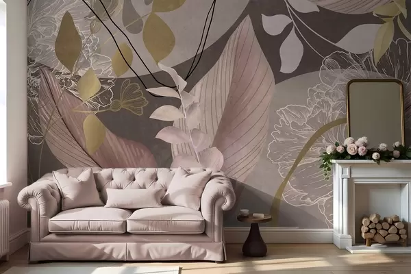 Fototapety Abstraktný kvetinový vzor s veľkými listami v odtieňoch tlmeného ružového a hnedého s tenkými čiernymi čiarami a bielymi kvetinovými obrysmi Nr. w09544