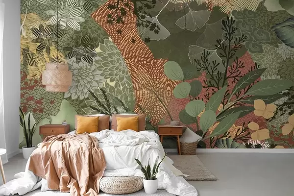 Fototapety Abstraktná textúrovaná koláž botanických prvkov s listami, kvetmi a organickými textúrami v odtieňoch zelenej a hnedej farby. Nr. w09545