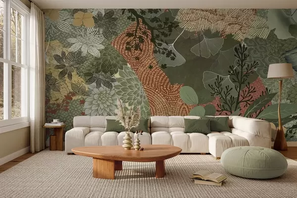 Fototapety Abstraktná textúrovaná koláž botanických prvkov s listami, kvetmi a organickými textúrami v odtieňoch zelenej a hnedej farby. Nr. w09545