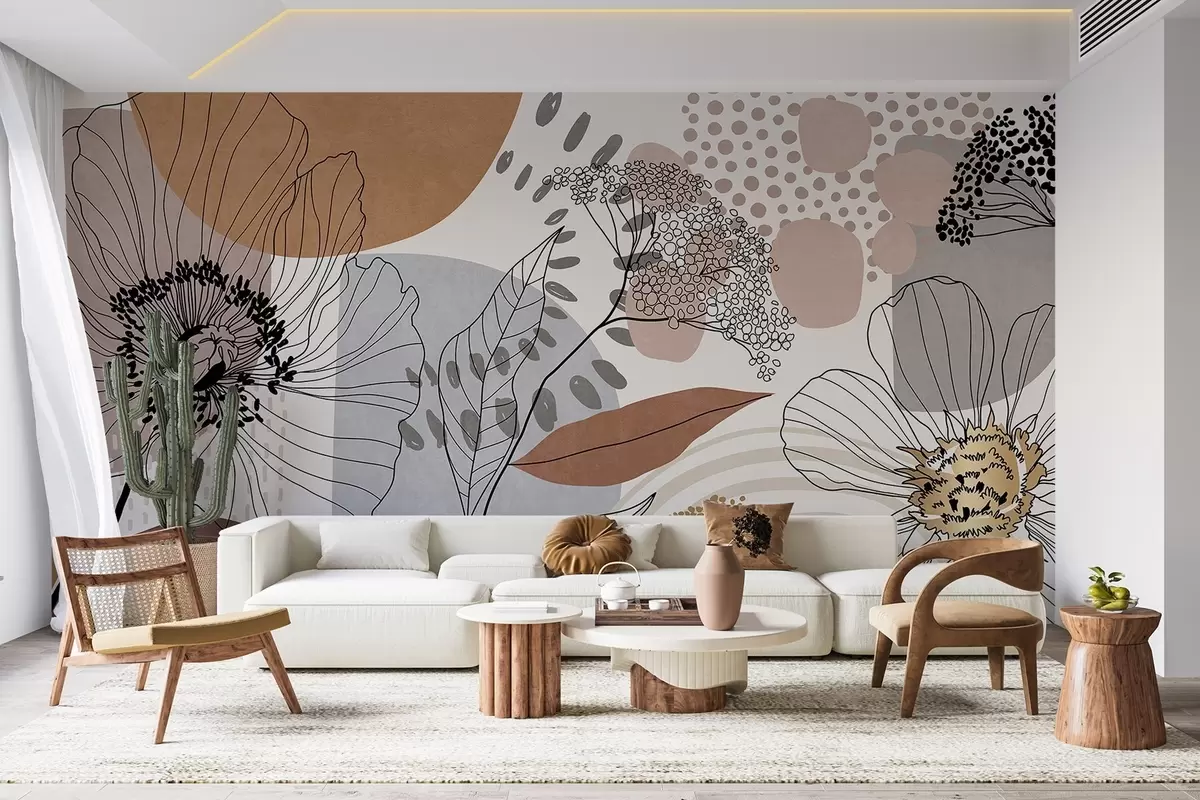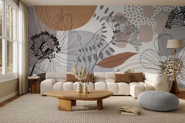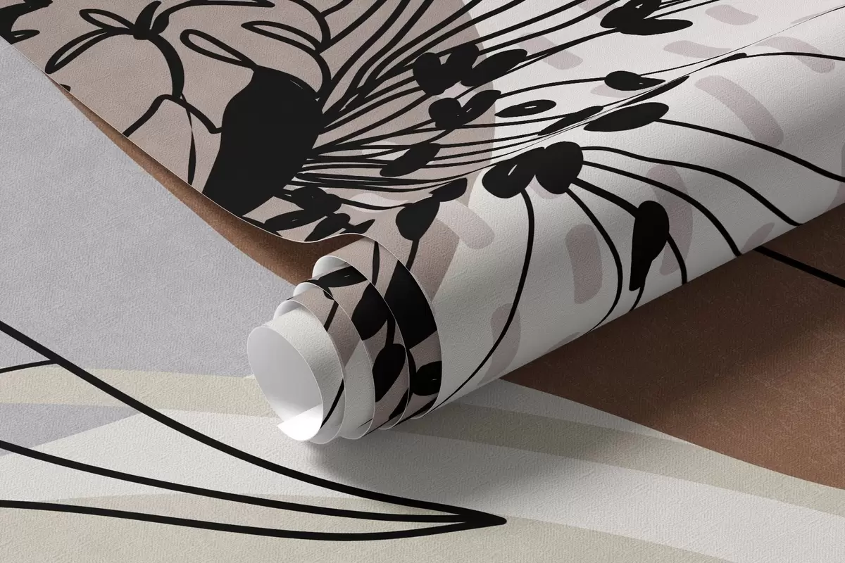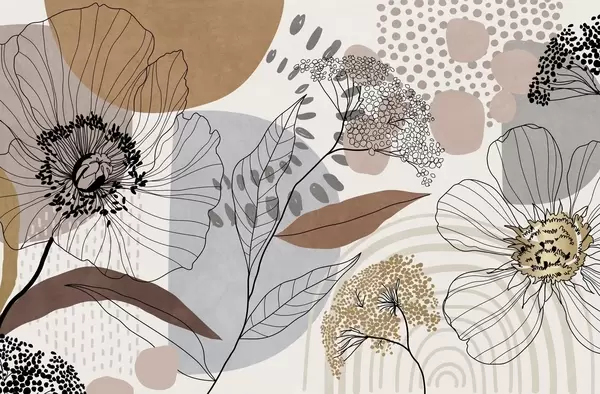 Fototapety Abstraktná kvetinová textúrovaná potlač s čiarovými kvetmi, listami a organickými tvarmi v tlmených hnedých, béžových a sivých odtieňoch. Nr. w09548