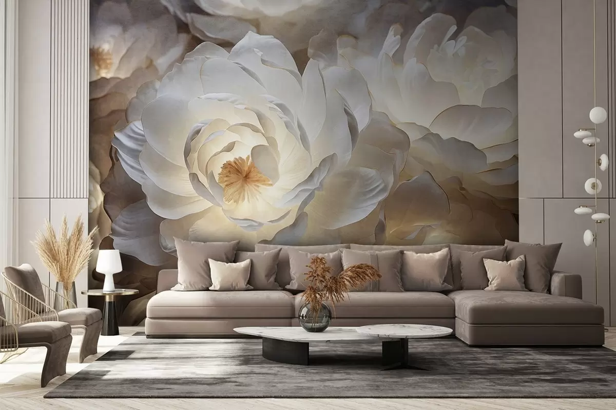 Fototapety Veľké, biele fantazijné kvety pivonky so žltým stredom, jemným osvetlením a jemnými, textúrovanými vrstvenými okvetnými lístkami. Nr. w09550