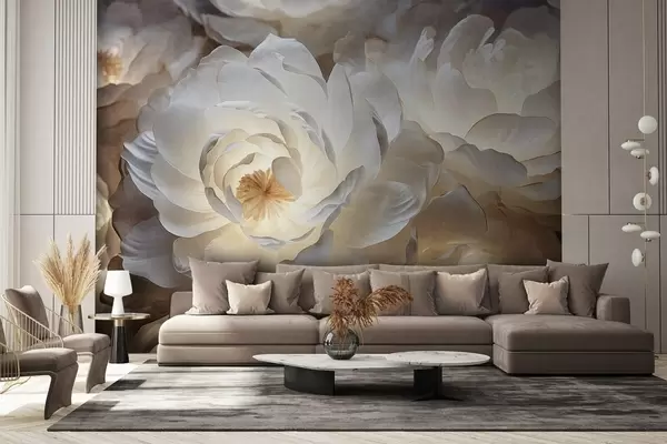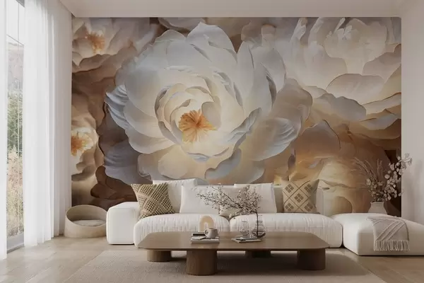 Fototapety Veľké, biele fantazijné kvety pivonky so žltým stredom, jemným osvetlením a jemnými, textúrovanými vrstvenými okvetnými lístkami Nr. w09550