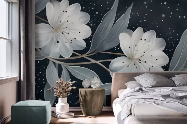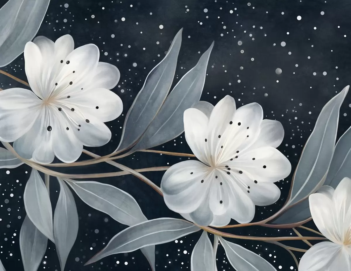 Fototapety Fantazijné biele kvety s textúrou, obklopené modrozelenými listami a vetvami na tmavom pozadí Nr. w09551