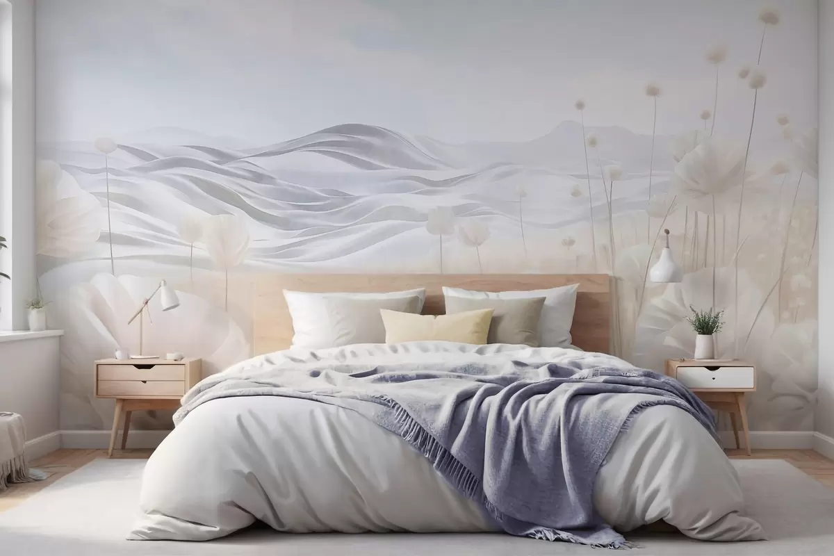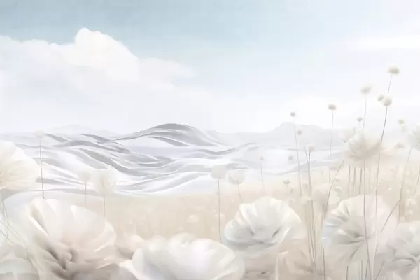 Fototapety Textúrované pole krémových makov s vlniacimi sa kopcami pod bledomodrou oblohou s jemnými oblakmi, pastelové farby Nr. w09553