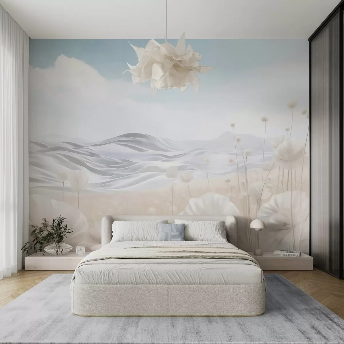 Fototapety Textúrované pole krémových makov s vlniacimi sa kopcami pod bledomodrou oblohou s jemnými oblakmi, pastelové farby Nr. w09553