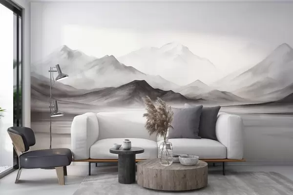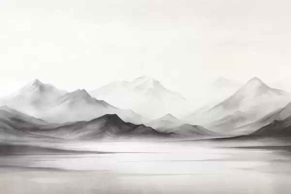 Fototapety Monochromatická textúrovaná krajina s hmlistými horami a jazerom v popredí Nr. w09555