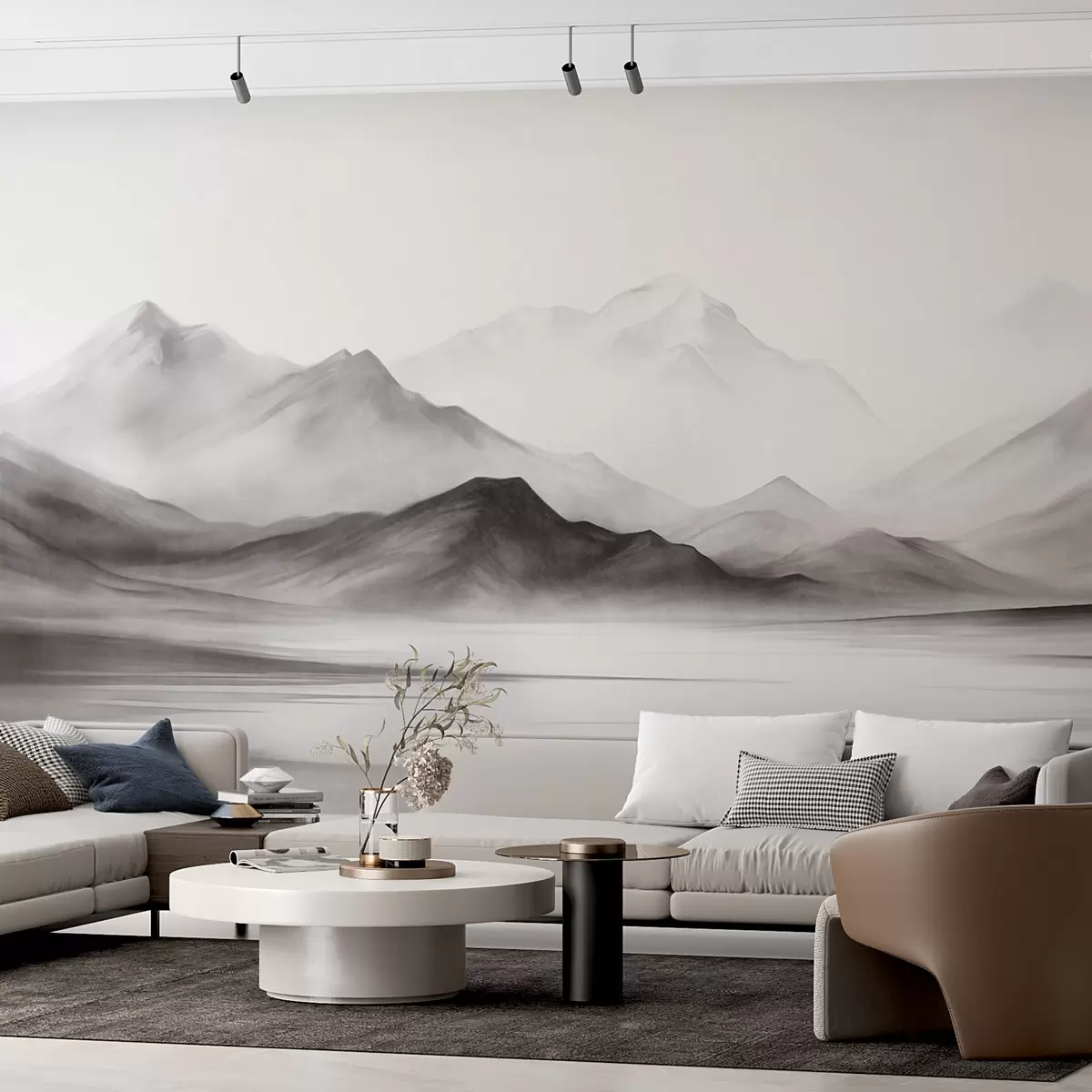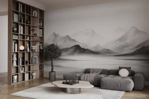 Fototapety Monochromatická textúrovaná krajina s hmlistými horami a jazerom v popredí Nr. w09555