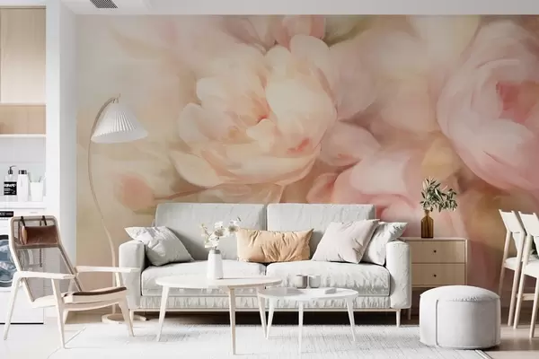 Fototapety Rozmazané bledo ružové a krémové pivonky s jemnými, maliarskymi ťahmi štetcom, vytvárajúce textúrované kvetinové aranžmány Nr. w09556