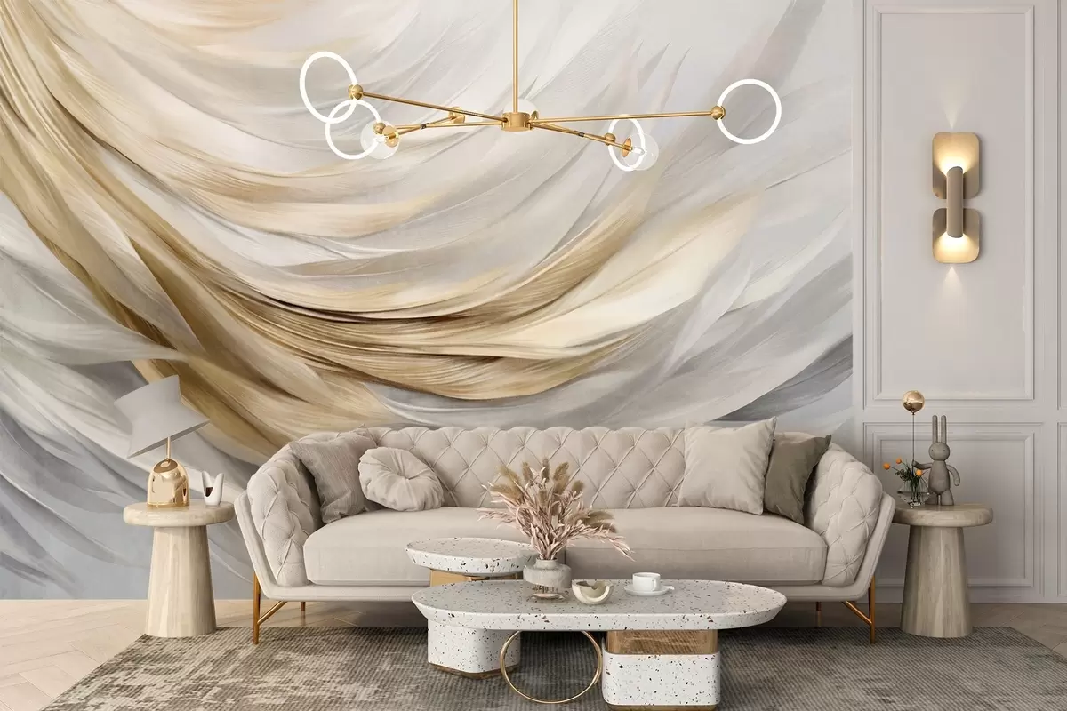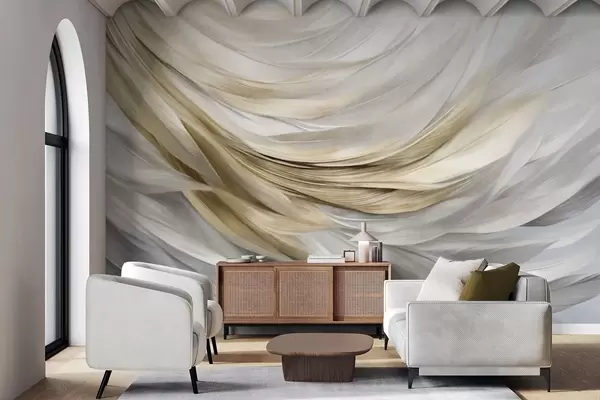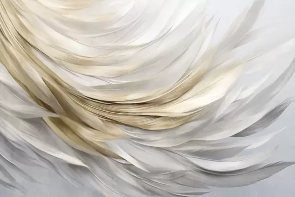 Fototapety Abstraktné textúrované biele, šedé a žlté perie, ktoré vytvára plynulý, vrstvený vzor na svetlom pozadí. Nr. w09557